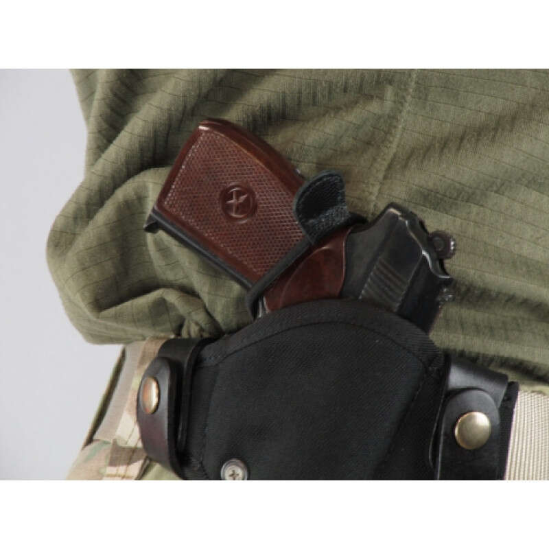 Швидкознімна кобура для прихованого носіння зброї на поясі. Забезпечує щільне прилягання до тіла. Завдяки переставному поясному кріпленню підходить для ременів шириною 40 і 50 мм. Саме кріплення виготовлене з ремінної шкіри та фіксується на кнопках, що, своєю чергою, дозволяє надягати й знімати кобуру, не знімаючи пояса.