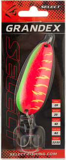 Блешня Select Grandex - універсальна і проста у використанні коливалка для лову хижої риби. Вона має яскраво виражену власну гру, при цьому абсолютно не вибаглива до активності проводки. На повільній швидкості амплітуда коливань стає трохи менше і приманка опускається глибше, а на швидкій - широко виляє, але не входить у штопор, а тільки іноді збивається з гри, що часто стає вирішальним фактором для атаки хижака. Ця блешня підходить для пошуку активної щуки та іншої хижої риби як у стоячих водоймах, так і на помірній течії.