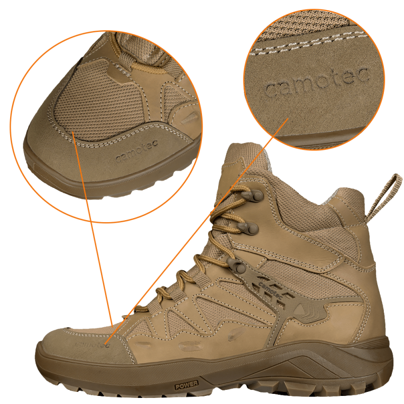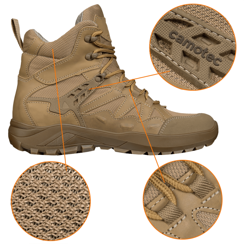 Черевики мають середню посадку та щільно прилягають до стопи. Вироблені в сучасному мілітарі стилі та мають систему швидкого шнурування (Металеві гачки замість останніх люверсів, які дозволяють вам швидко накинути шнурок, а не шнурувати черевики повністю).