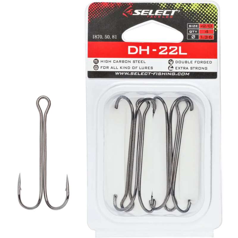 Двійник Select DH-22L - модель зі збільшеною довжиною цівки, призначена для оснащення силіконових приманок. Розміри підібрані таким чином, щоб практично будь-які віброхвости і твістери можна було озброїти гачком, не обрізаючи тіло приманки. Двійники виготовлені з міцної високовуглецевої сталі, мають лазерну заточку жала і достатню пружністю для утримання великої риби. Подвійне оксидоване покриття гачків на довго захищає їх від окислення навіть при тривалому використанні.