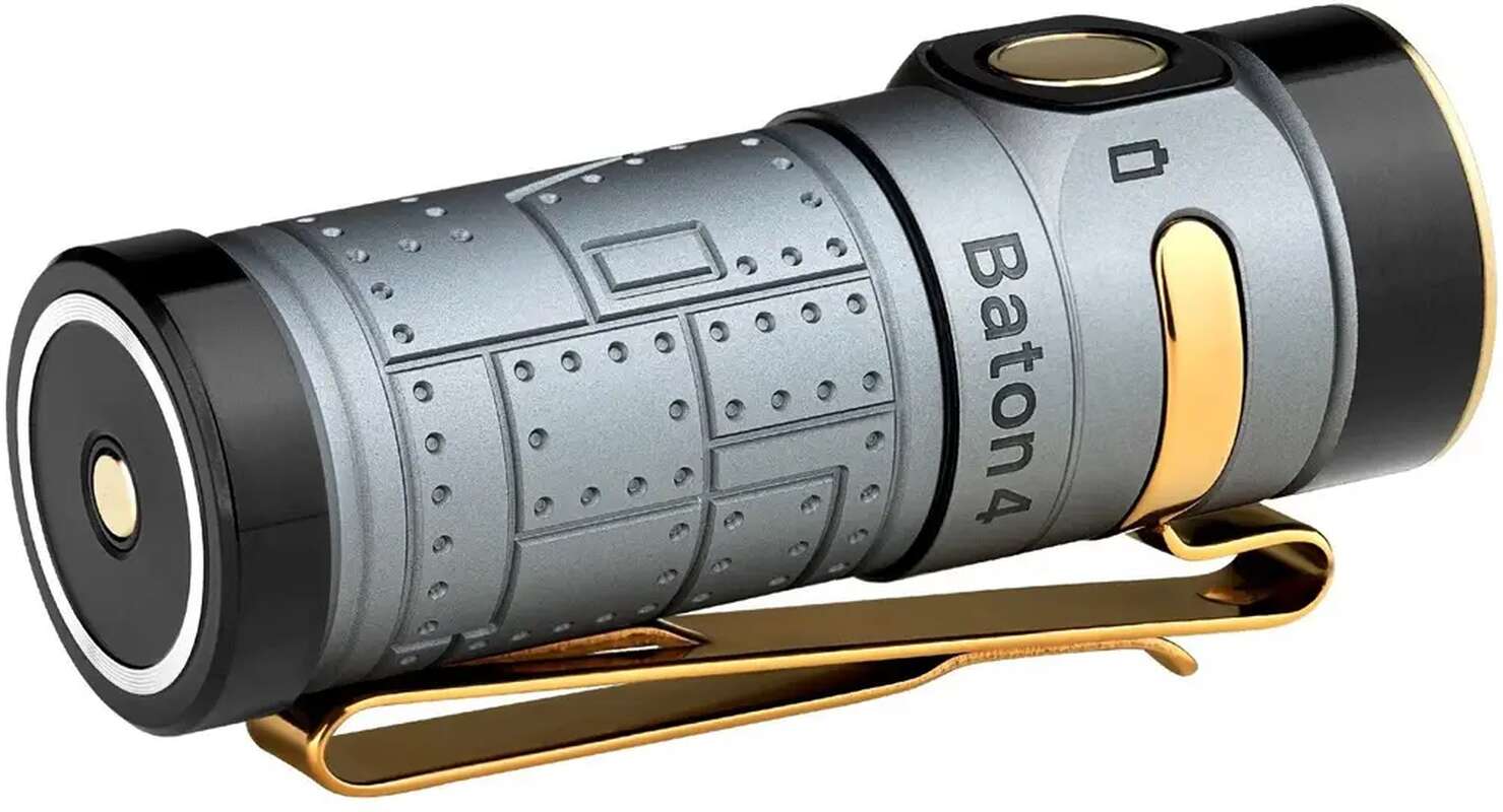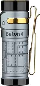 Модель Baton 4 продовжує серію компактних EDC ліхтарів від Olight. Цей легкий і компактний ліхтар, оснащений високоефективним світлодіодом CW LED і лінзою TIR, що забезпечує збалансований світловий потік до 1300 люмен і дальність до 170 метрів. У мінімальному режимі (0,5 люмен) ліхтар може безперервно світити до 30 днів. Baton 4 має 5 режимів освітлення та режим Strob, що перемикаються зручним металевим перемикачем.