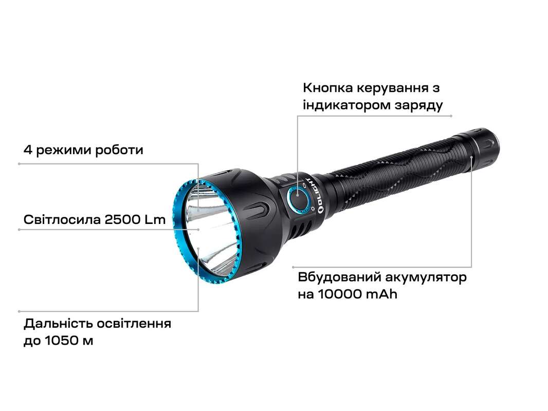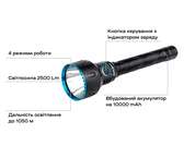 Максимальна яскравість ліхтаря становить 2500 lm, є 4 режими роботи.