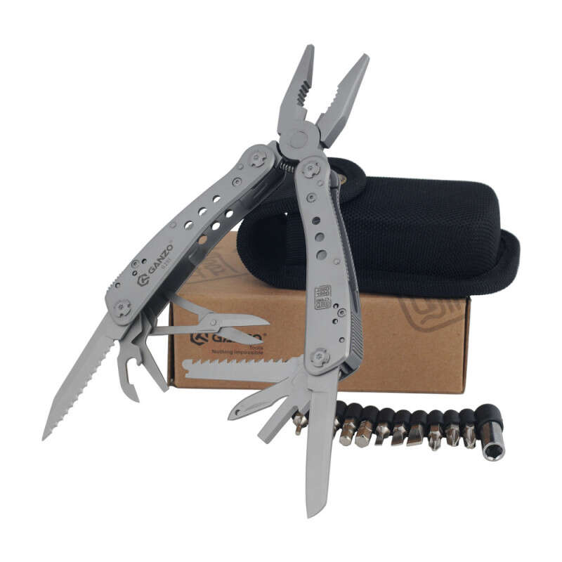 Мультитул G201 від Ganzo - це дійсно універсальний мульти-інструмент, який стане незамінним помічником будь-якій сучасній людині, незалежно від роду діяльності, віку та статі. У ньому є буквально все! Ніж-серрейтор, прямий ніж, пила, ножиці, викрутка і десять змінних біт, шило, консервний ніж, відкривачка для пляшок, шило з петлею, кусачки і плоскогубці. І все це вмістилося в мультитул вагою трохи більше 250 грамів.