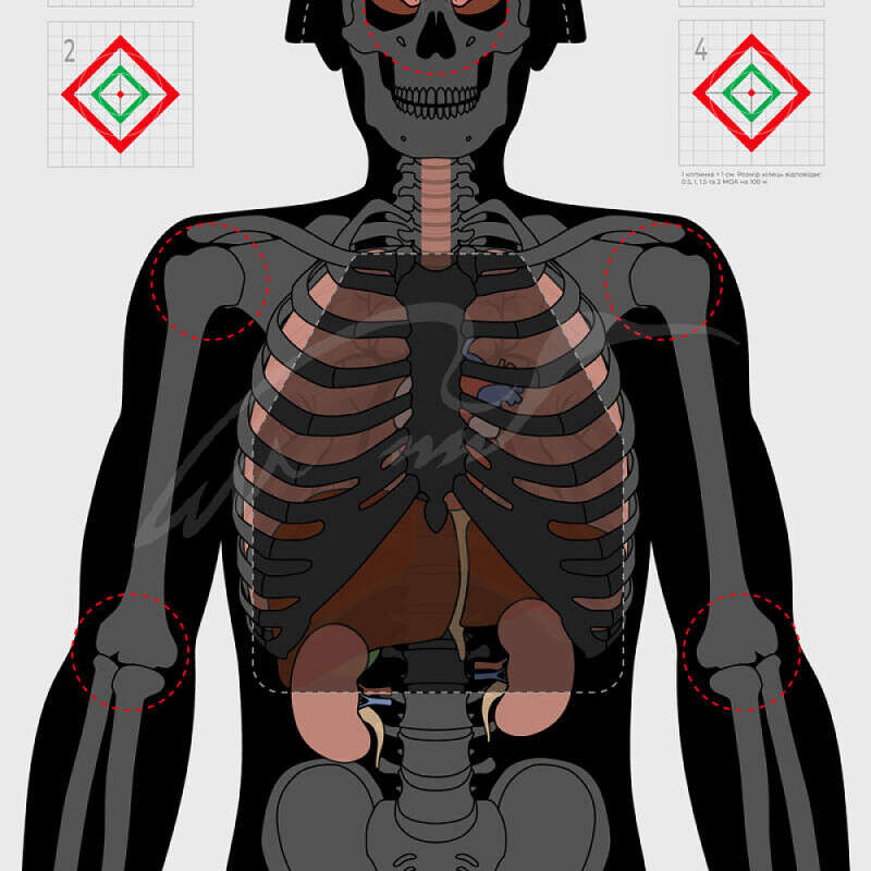 Мішень Ібіс Силует містить зображення людського силуету в натуральну величину з розміткою зон пріоритетного ураження. Вона доповнена 4 додатковими пристрілювальними мішенями з розмірами кілець 0,5, 1, 1,5, 2 МОА на 100м. Мішень Силует роздрукована на папері щільністю 80г м2 і призначена для тренувальної стрільби, вдосконалення стрілецьких навичок та необхідних заходів самооборони з вогнепальною зброєю.