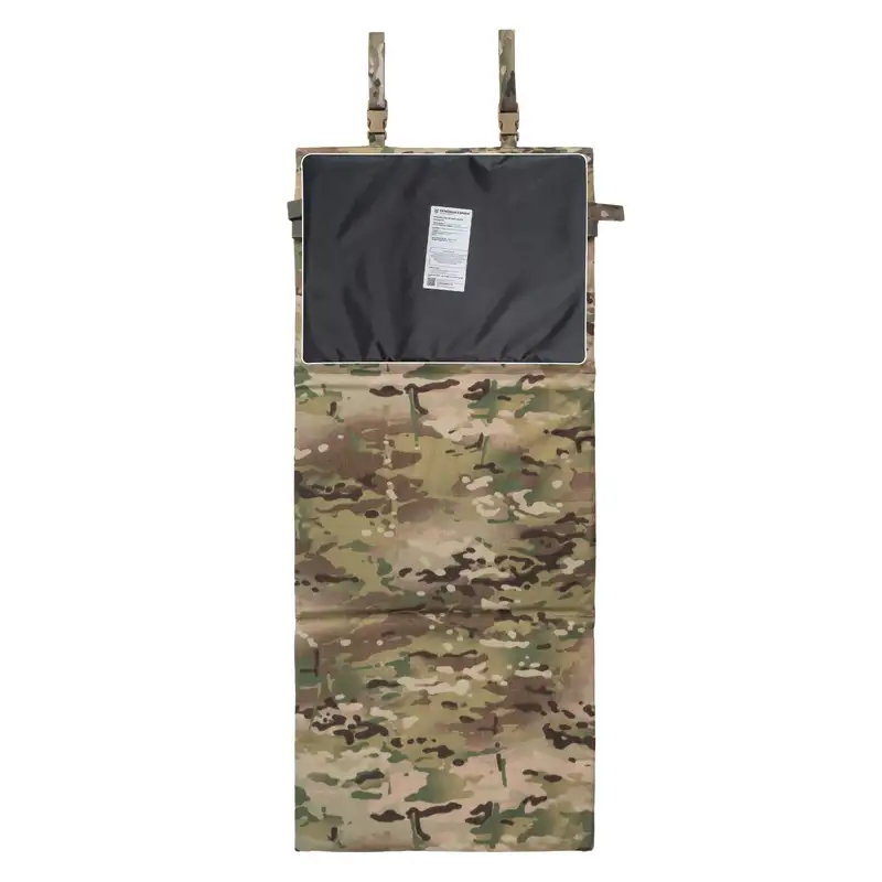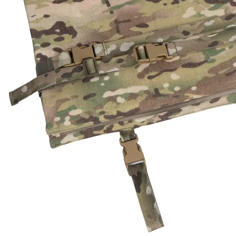 Каремат для сидіння розкладний від бренду Українська Броня. Він кріпиться до тактичного пояса або плитоноски за допомогою строп з липучками позаду себе і за допомогою двох строп з фастексами попереду себе. За допомогою двох строп з фастексом також є можливість закріпити каремат на поясі та швидко розкривати/закривати каремат на потрібний розмір.