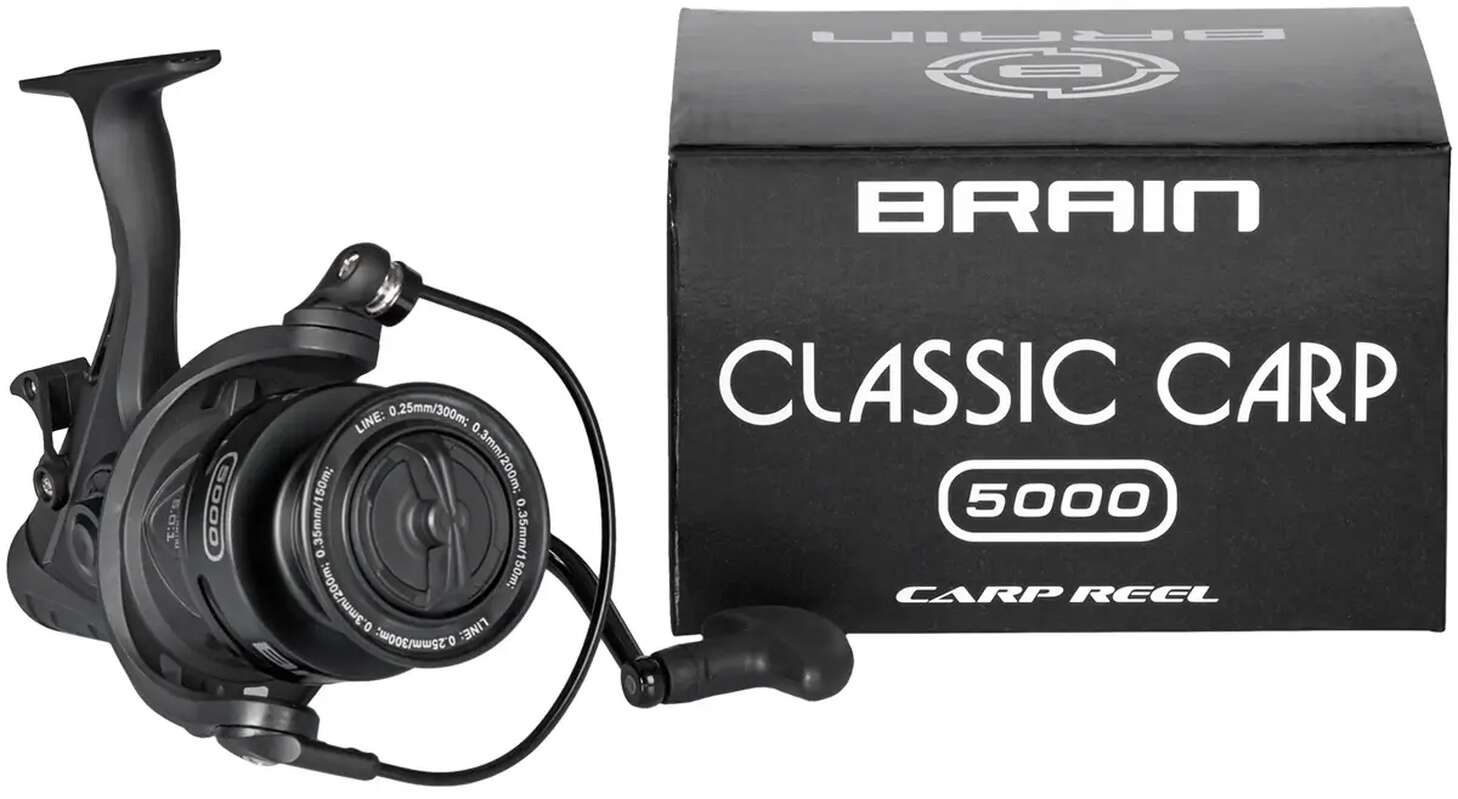 Котушка Brain Classic Carp Baitrunner - недорога модель, призначена для лову білої риби фідерними і короповими снастями. Вона оснащена системою бейтраннер, яка забезпечує вільний схід волосіні, що запобігає утаскування вудилища рибою, що клюнула. Котушка має строгий дизайн, її корпус виконаний з міцного пластику чорного матового кольору. Механізм налічує 4 шарикопідшипника для м'якого обертання і 1 роликовий, який забезпечує миттєвий стопор зворотного ходу. Конусна металева шпуля розрахована на здійснення далеких закидів. Вона оснащена латунною підпружиненою кліпсою, яка допоможе фіксувати дальність закидання, якщо система бейтраннер не використовується. Дуже приємним бонусом в конструкції цієї бюджетної котушки є металева точена ручка, яка вкручується у вісь ведучої шестерні. Це дозволить значно продовжити її термін служби і уникнути швидкої появи люфтів.