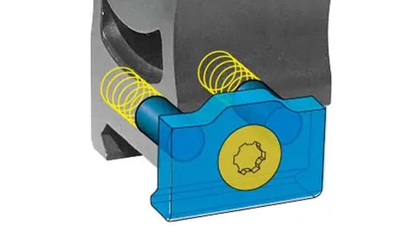 - система з одним гвинтом і двома пружними штифтами на бічній фіксувальній пластині дає змогу уникнути перекосу кріплення, що може виникнути, наприклад, у разі нерівномірного закручування двох гвинтів, при цьому сама пластина сталева;