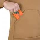 Худі має класичну форму, з дещо доповненим функціоналом. Конструкція плечової частини має форму рукава-реглана, що передбачає відсутність верхнього шва, це запобігає натиранню під час постійного носіння рюкзака. Також, варто зазначити, що худі має подовжений крій, тому добре захищає поперек. Капюшон особливої форми гарантує чудове прилягання до тіла. Основна кишеня-кенгуру для рук і особистих речей – наскрізна й глибша від аналогів, щоб запобігти випаданню вмісту.