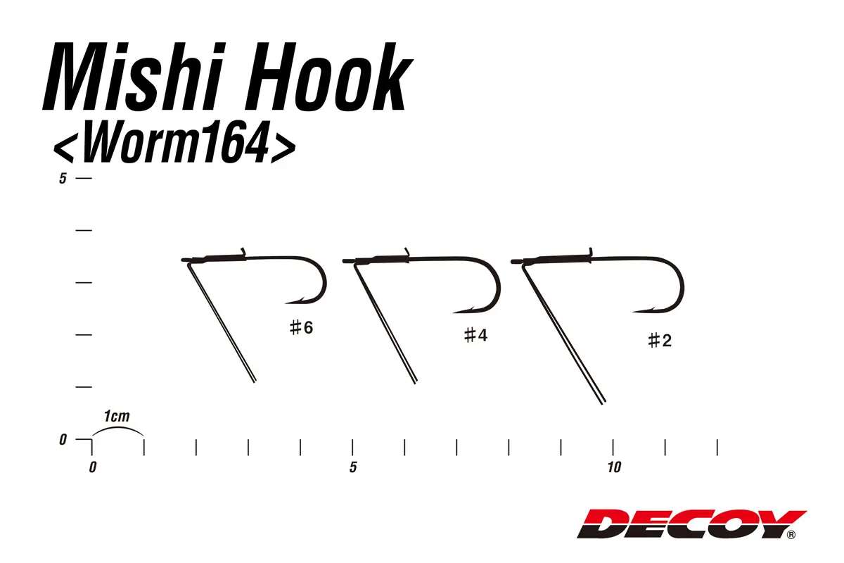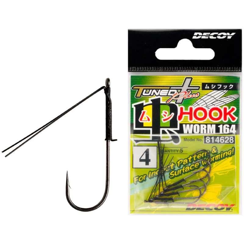 Decoy Worm 164 - спеціалізовані гачки для лову на поверхневі (плаваючі) силіконові приманки. У робочому положенні приманка з таким гачком розташовується жалом униз, при цьому жало гачка захищено двома вусиками з жорсткої волосіні. Цівку гачка обмотано щільними нитками і в центрі цівки є спеціальний вусик-зачіп для надійної фіксації приманки.