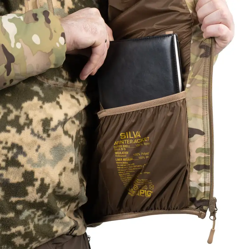 Куртка має розвинену систему з шести кишень. Дві нагрудні кишені добре підходять для зберігання документів або мобільного телефону. Внизу спереду є дві об'ємних кишені, які можна використовувати для перенесення спорядження, засобів зв'язку або зігріву рук. Усередині куртки "SILVA-Camo" є дві кишені для зручного перенесення документів, блокнотів або рукавичок. Комір додатково утеплений флісом, для забезпечення комфорту використання та утеплення зони шиї. Фронтальна двостороння блискавка має інтегрований захист підборіддя.