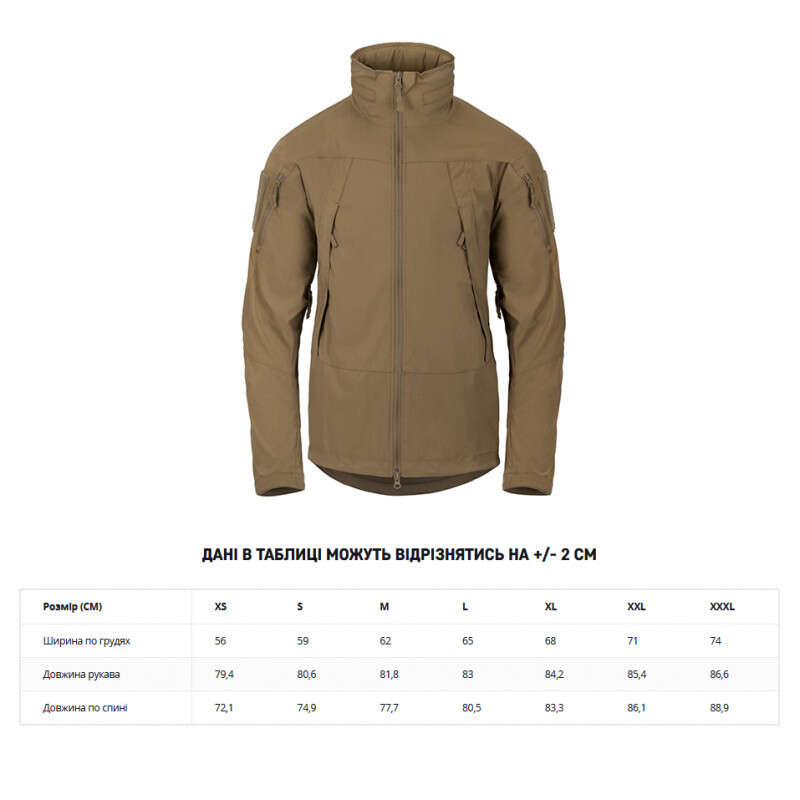 - Особливості: Регульований капюшон із козирком (ховається в комір), вентиляційні отвори під пахвами з сіткою, 2 нагрудні кишені з органайзерами, 2 кишені на біцепсах, Velcro-патчі для ідентифікації, еластичні регульовані манжети та низ, YKK® блискавки, дихаюча та вітрозахисна