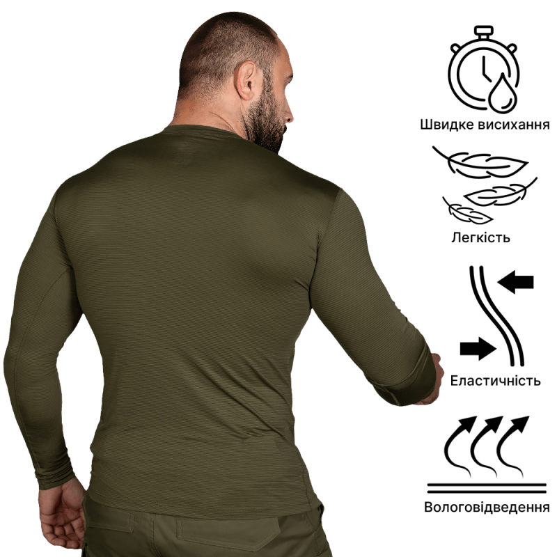 Лонгслів має, ергономічний дизайн, з урахуванням анатомії людини. Легкий та комфортний, не сковує рухів, не натирає при тривалій експлуатації.