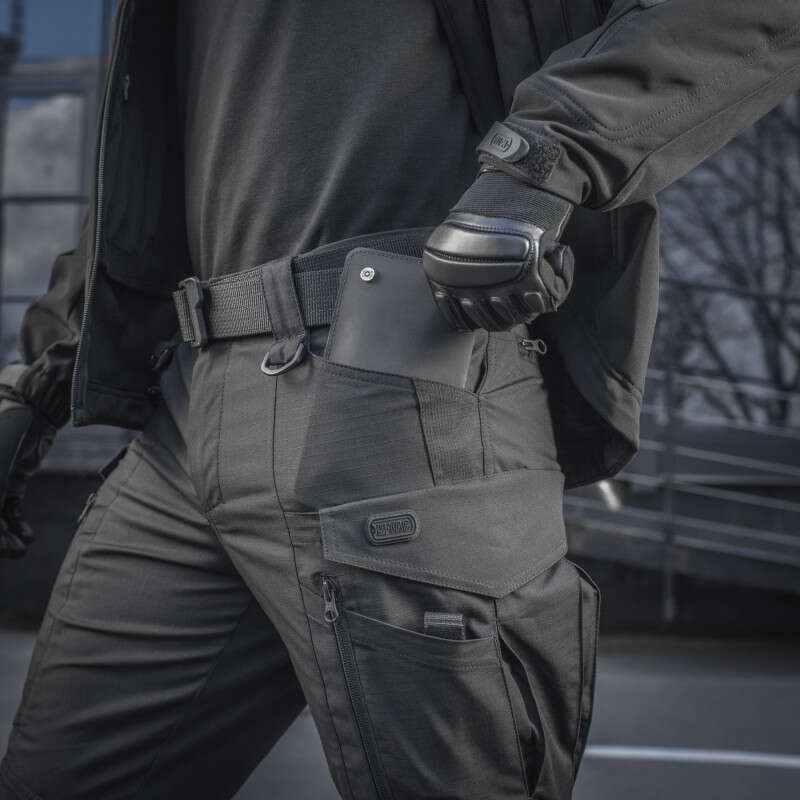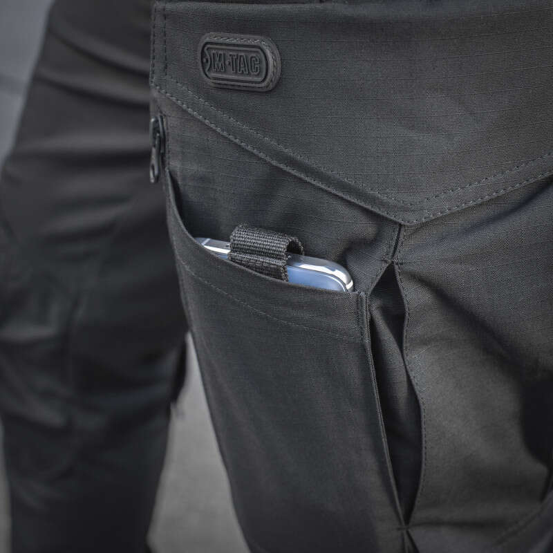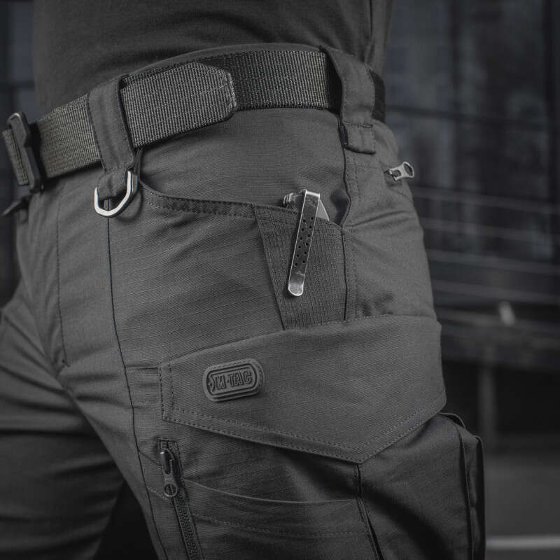Пояс закривається на блискавку і гудзик, обладнаний шлейками для ременя шириною до 5,5 см, Спереду до поясу пришиті два D-кільця для підвісу різного устаткування. Штани обладнані великою кількістю кишень, як утилітарних, так і спеціальних: всього їх вісім. Стандартні брючні бічні кишені обладнані посиленням в нижній частині - для кріплення кліпси ножа або ліхтаря за край кишені. Задні прорізні кишені закриваються на «блискавку».