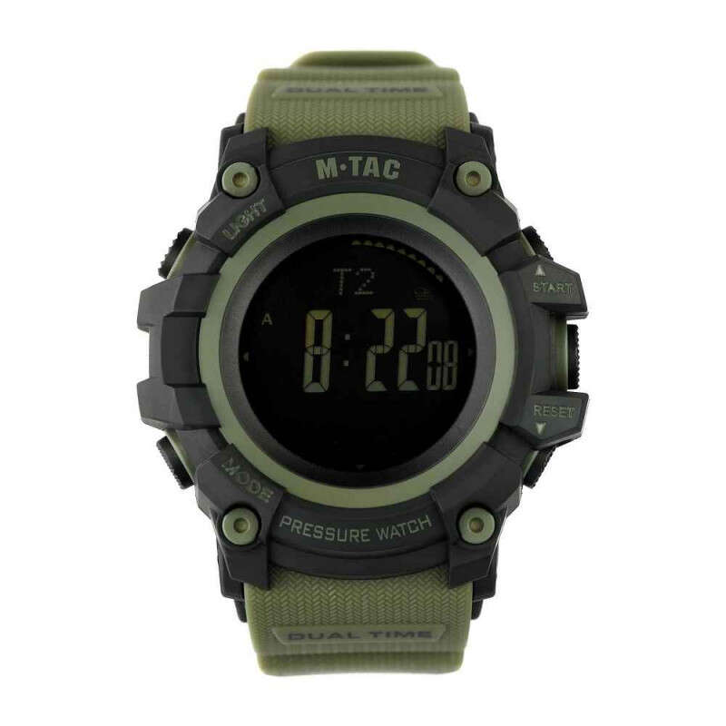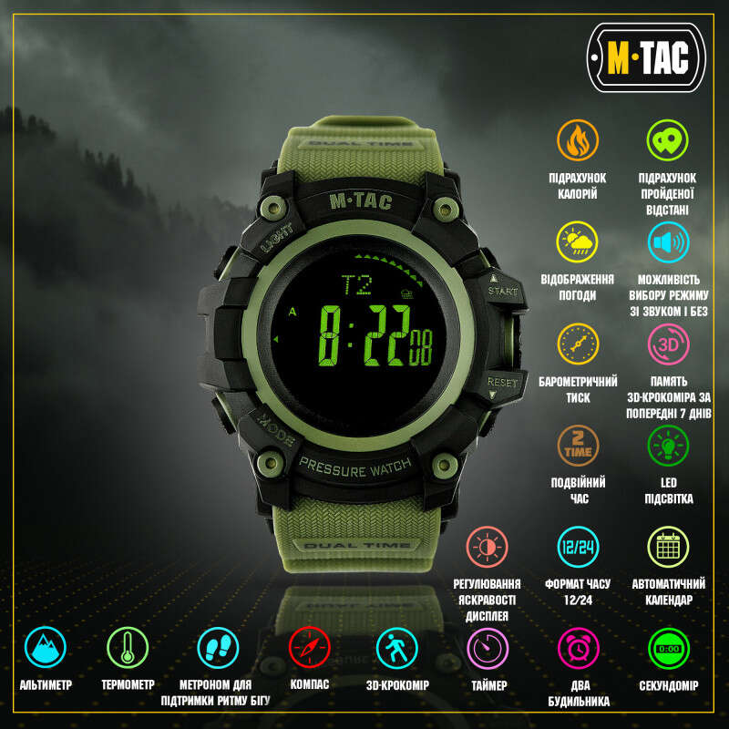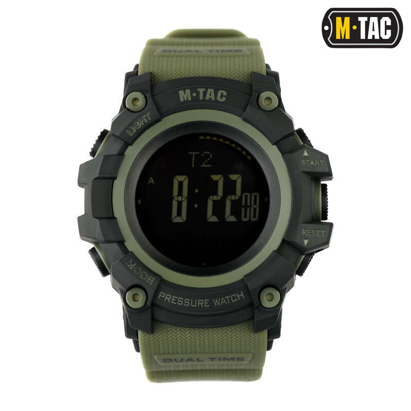 Годинник з широким функціоналом M-Tac. Дана модель стане незамінним помічником людям, які ведуть активний спосіб життя, які люблять походи в гори, також чудово підійдуть для військових. Унікальні функції, якими володіє годинник M-Tac стануть в нагоді не тільки людям, які займаються екстремальними видами спорту, наприклад такі як: стрибок з парашутом, а й стануть незамінним помічником в повсякденному житті. Годинники зможуть показати Вам значення атмосферного тиску, також покажуть температуру повітря. Відстежуючи показання годин можна заздалегідь передбачити погіршення стану здоровя, і грамотно розподілити свою навантаження в даний час.