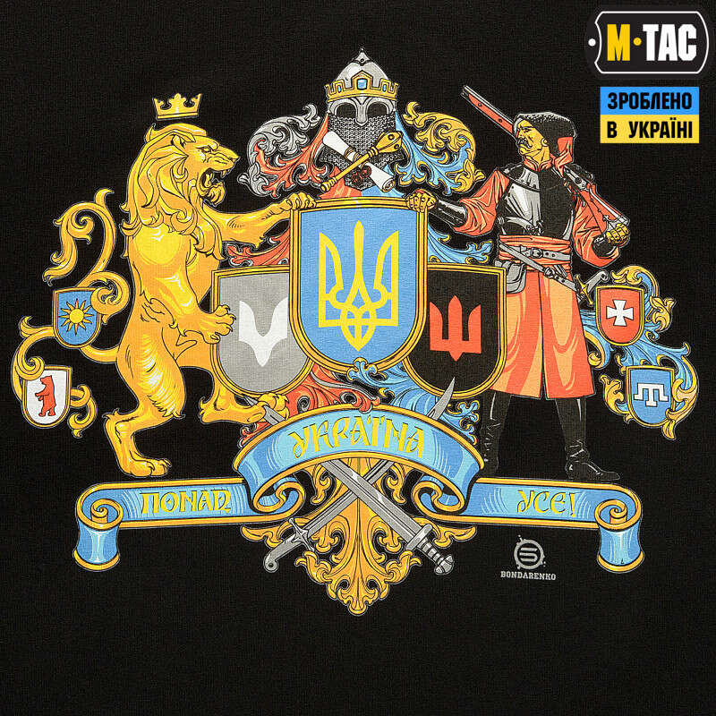 Оригінальна футболка «Україна понад усе» від M-Tac містить інтерпретацію на тему великого Державного Герба України від відомого художника-ілюстратора Олексія Бондаренка. Даний принт уособлює цілу низку історичних подій. Зокрема, у центрі зображення розміщені малий Державний Герб України, герб Святослава та тризуб УНР. По обидва боки від щитів зображено щитотримачів: золотий лев, який вважається символом Галицько-Волинського князівства, та козак з мушкетом, який уособлює Військо Запорізьке. Вони символізують об'єднання сходу та заходу України. Увінчує принт шолом із короною – символ княжої влади в Київській Русі. Знизу розміщена стрічка в національних кольорах із написом «Україна понад усе», що ще більше підсилює смислове навантаження виробу.