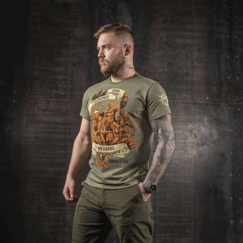 Футболка M-Tac ZERO TOLERANCE TO INVADERS. Модель виготовлена з бавовни и еластана. Завдяки цьому футболка витримує не один десяток прання і не втрачає при цьому форми. «Нульова толерантність до завойовника» - це головна ідея цього яскравого і стильного принта. Принт присвячений історичним подіям 1036 року. Коли київський князь Ярослав Мудрий завдав остаточної нищівної поразки печенігам, які довгий час здійснювали набіги на Київську Русь. Минають віки, але традиції предків досі залишаються на нашій землі.