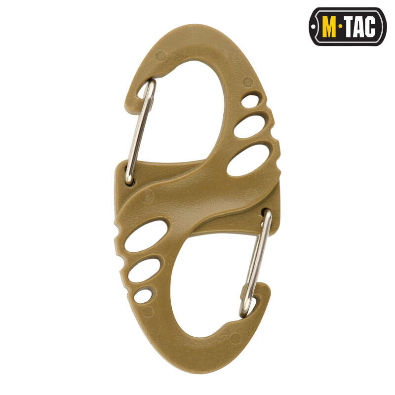 Компактний двосторонній S-type карабін від бренду M-Tac- компактний і легкий, призначений для кріплення ключів, ліхтарів, легкого спорядження. Невеликий розмір і вага дозволить взяти з собою кілька карабінів. Не призначений для альпінізму або кріплення важких речей.