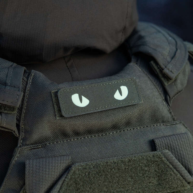 M-Tac нашивка Cat Eyes Laser Cut, так званий Morale patches, кріпиться на майданчик з велкро-липучки бейсболки або рюкзака, (на самому патчі зі зворотного боку пришита відповідна липучка). Зображення виконано зі світлонакопичувального матеріалу, що світиться в темряві.