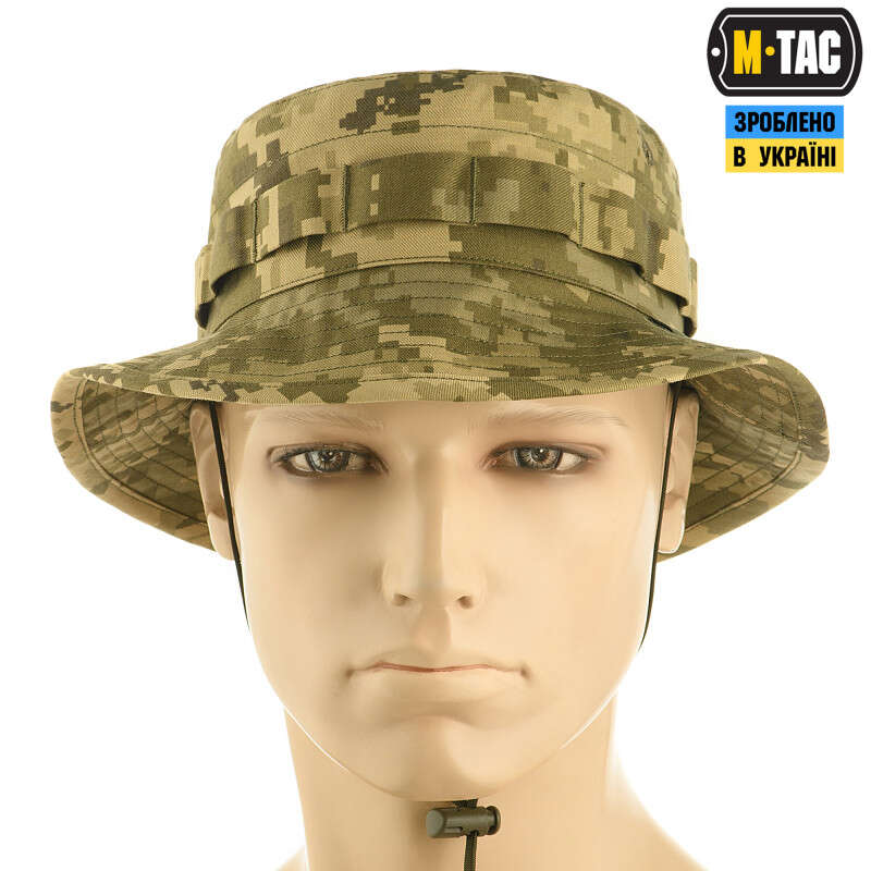 Армійська панама в MM14 від бренду M-Tac зроблена за зразком легендарної американської моделі Boonie. Має крій із напівжорсткими полями. Туллі з нашитою по периметру стрічкою, яка розрахована на кріплення додаткових засобів маскування. Забезпечена спеціальним шнуром, що не дозволить панамі злетіти з голови під час сильних поривів вітру. Також вона має три вбудовані люверси, які забезпечують відмінну вентиляцію. Панама виготовлена з легкої та міцної тканини: 50% бавовна, 50% поліестер. Це оптимальне поєднання стійкості до зносу та повітропроникності. Саме такої якості матеріал йде на пошиття уніформи для військових у Британії. Зі вивороту всі шви приховані. Такий спосіб їхньої обробки робить панаму більш комфортною при тривалому носінні, а також підвищує її стійкість до зносу.