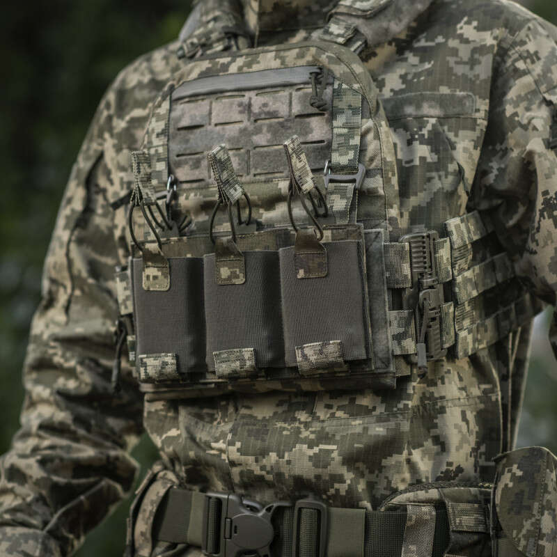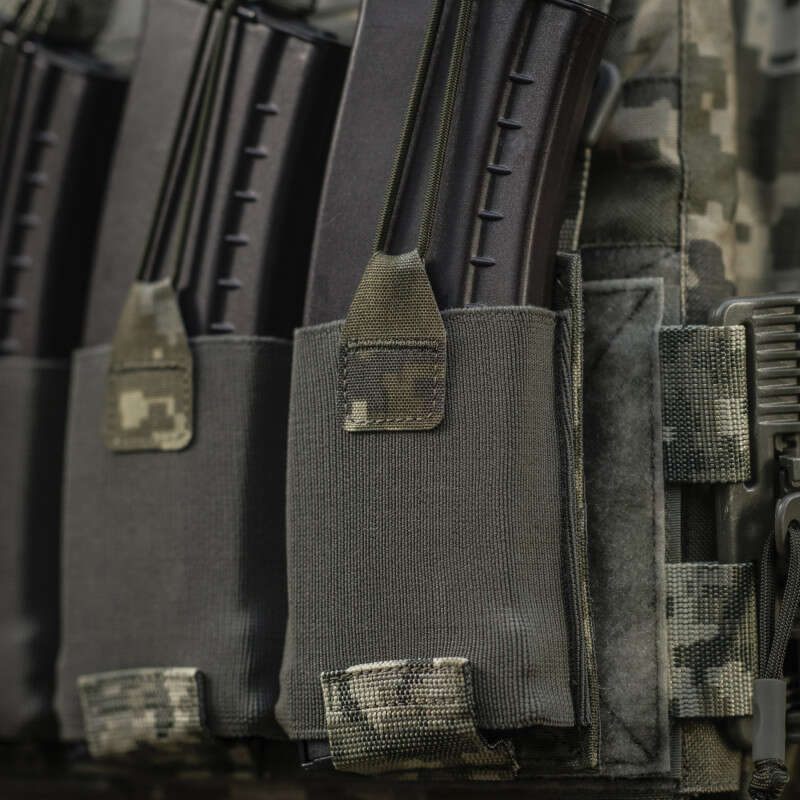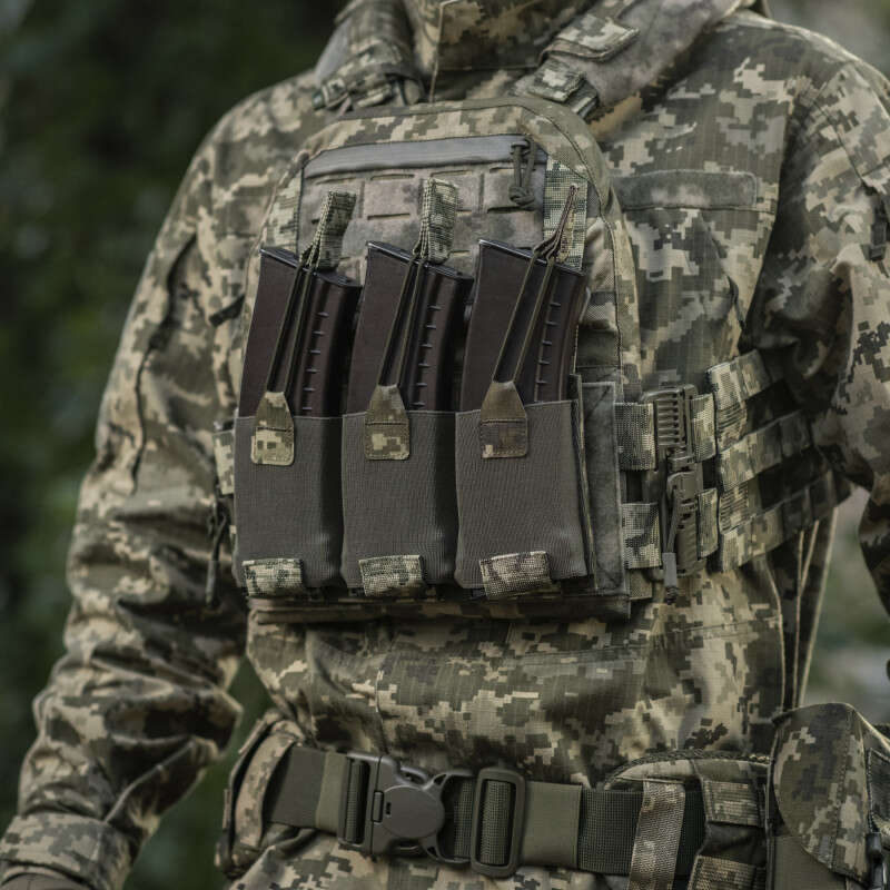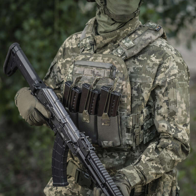Знизу бронежилета знаходиться швидкознімний модуль з 3 підсумками, які надійно утримують магазини. Щоб уникнути випадкового зривання з основи Velcro, він кріпиться до строп на плитоносці за допомогою карабінів Woojin.