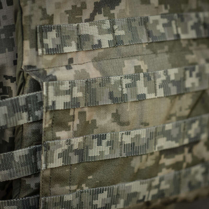Виготовлена з високоякісного матеріалу Cordura 500D – надміцної тканини, стійкої до стирання і високих навантажень. З внутрішньої сторони плитоноски є вставки з 3D сітки, які забезпечують амортизацію та циркуляцію повітря. Ергономічні плечові лямки зручні у використанні й органічно повторюють контури тіла. Скелетоподібний камербанд значно зменшує вагу виробу і при необхідності дозволяє розмістити підсумки.