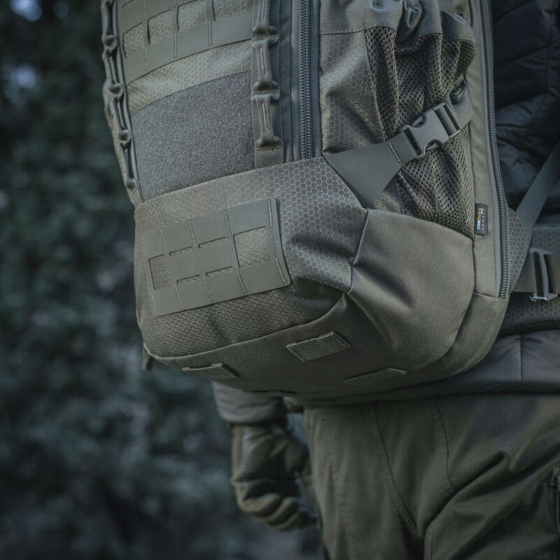 Виготовлений з Cordura 500D та Cordura Hex 1000 – якісного та зносостійкого матеріалу, що забезпечить захист від механічних пошкоджень та тривалий термін експлуатації. Спереду та з боків рюкзак оснащений системою MOLLE LASER CUT, що дозволить за необхідності збільшити обєм за допомогою додаткових підсумків.