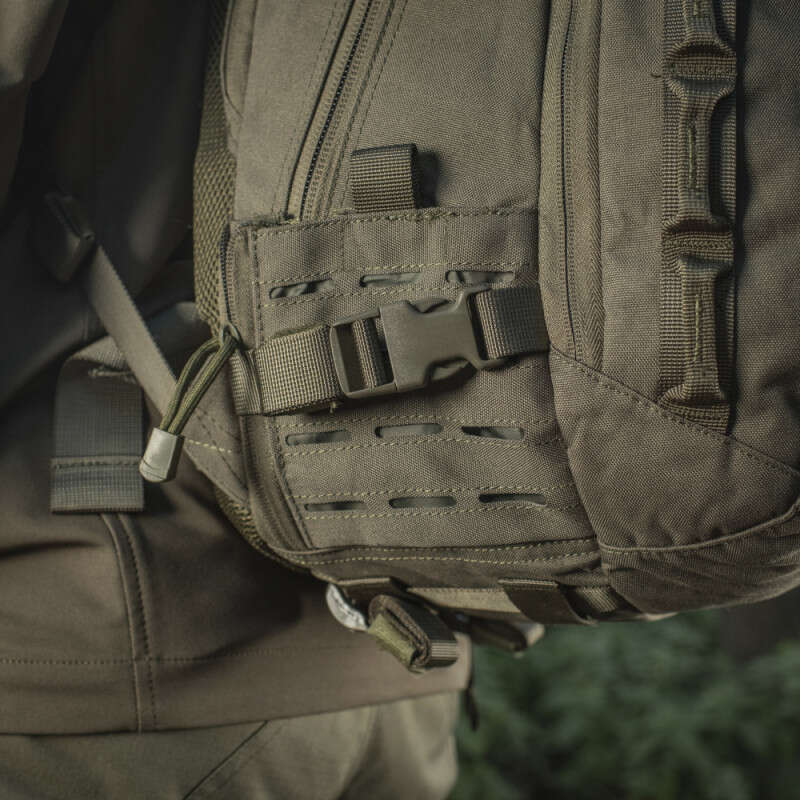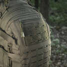 Ви можете зафіксувати вміст кишені за допомогою регульованої по довжині стропи з фастексом. Інтерфейс рюкзака забезпечений панелями molle, виконаними за технологією Laser Cut. Laser Cut - це сучасна технологія зовнішнього кріплення модульних підсумків (замість звичайних нашивних PALS-строп). Вона полягає в тому, що в шарі матеріалу лазером вирізається кілька рядів спеціальних отворів, які, в свою чергу, дозволяють кріпити стандартні підсумки з MOLLE-кріпленням.