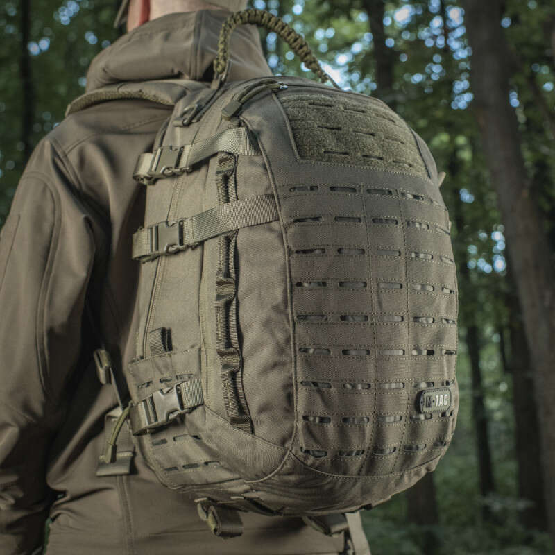 M-Tac рюкзак Mission Pack Laser класифікується як міський тактичний, штурмовий рюкзак. Виготовлений даний рюкзак з міцних синтетичних матеріалів. З боків і фронтальної частини рюкзак оснащений системою MOLLE LASER CUT, що дозволить при необхідності збільшити обсяг рюкзака додатковими подсумками. Рюкзак оснащений чотирма відділеннями. Перше і основне відділення додатково забезпечено відділенням для гідратора і має клапан виведення трубки питної системи або дротової гарнітури. Так само на спині є окремий кишеню для гідро системи, що при бажанні може відокремити питну систему від основного відділення. Третє відділення забезпечене органайзером, що дозволить зручно розмістити переносна спорядження і необхідні речі. Четвёрное маленьке відділення для документів і мобільного телефону.