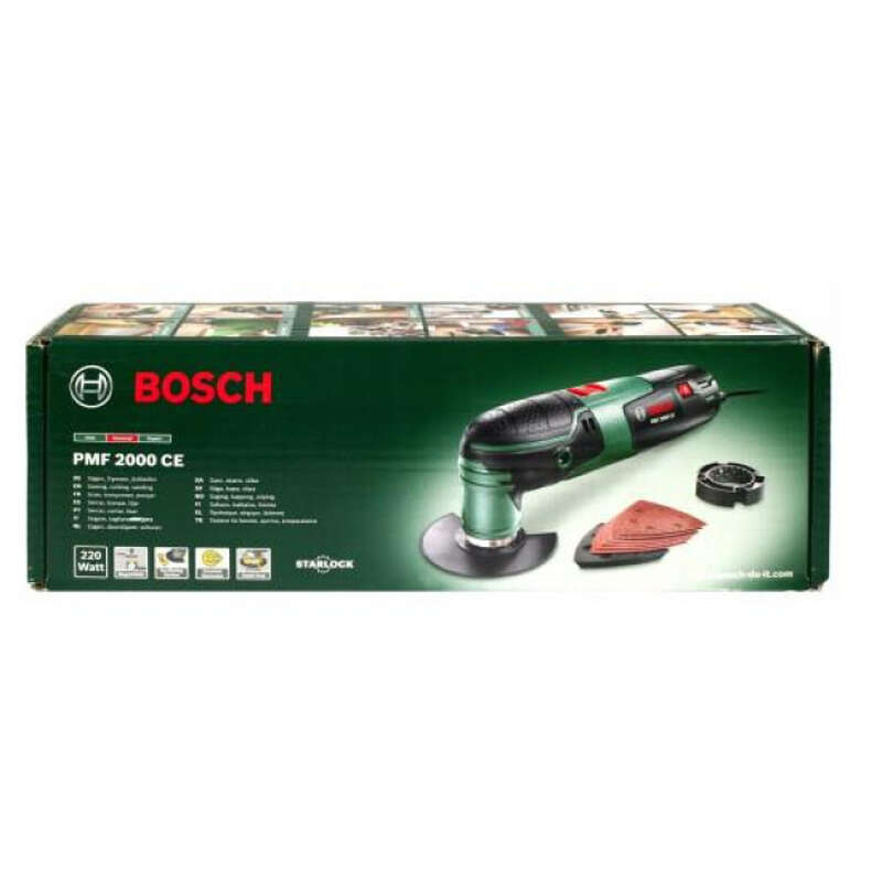 Мультиінструмент Bosch PMF 2000 CE потужністю 220 В з регулюванням та утримуваням константною електроныкою частоти ходів (від 15000 до 20000 ход/хв), кутом коливань зліва/справа 2,8 градуса. Магнітний патрон з універсальним гвинтом для простої перевстановлення аксесуарів з кріпленням Starlock. 4-рівневий обмежувач глибини. Поставляється у картонній упаковці з сегментованим пиляльним диском, набором дельташліфлистів, дельташліфпластиною.