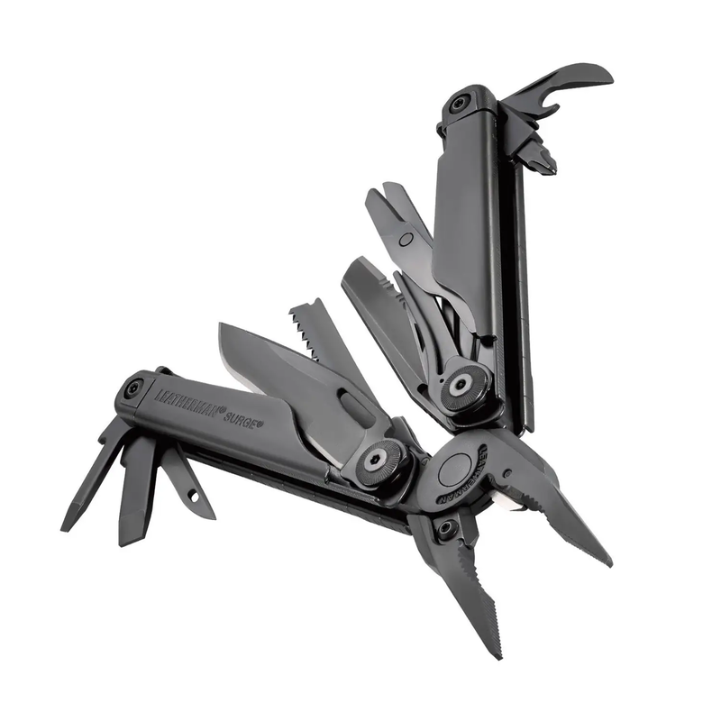 Мультитул Leatherman Surge - одна з найпотужніших моделей преміум - класу в лінійці. Використовуючи спеціальний отвір в клинку можна відкривати інструменти однією рукою. Завдяки новій системі установки інструментів ножі, напилок і ножівку можна привести в робоче положення, не розкриваючи мультитул повністю. У рукоятці розташовані тримачі для великих і малих біт. Особливо слід відзначити наявність роз'єму Бош під Т-подібний хвостовик. Штатно там встановлена пила по дереву, напилок з алмазним напиленням йде в комплекті.