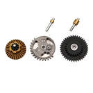 Super Shooter 13:1 High Speed Gearset - базовий набір шестерень з високим крутним моментом (13:1) для Gearbox Ver.2/3 виготовлений методом лиття із сталі NAK80, що забезпечує високий опір зносу і зривам, бездоганну роботу редуктора, зменшує розхід заряду акумулятора. У комплект входять роз'ємні вали секторної та центральної шестерень, що допомагає зберегти шестерні в разі неправильного шиммінгу. На секторній шестірні встановлений підшипник і рухомий таппет. Набір призначений для пружин від M100.