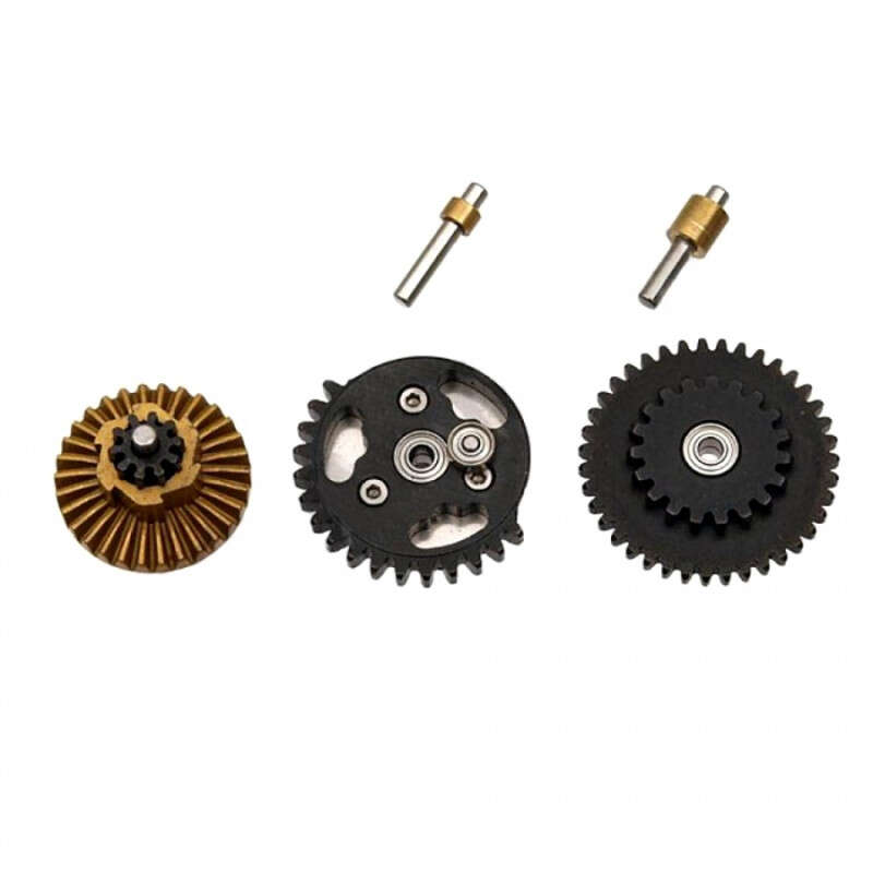 Super Shooter 14:1 High Speed Gearset - базовий набір шестерень з високим крутним моментом (14:1) для Gearbox Ver.2/3 виготовлений методом лиття із сталі NAK80, що забезпечує високий опір зносу і зривам, бездоганну роботу редуктора, зменшує розхід заряду акумулятора. У комплект входять роз'ємні вали секторної та центральної шестерень, що допомагає зберегти шестерні в разі неправильного шиммінгу. На секторній шестірні встановлений підшипник і рухомий таппет. Набір призначений для пружин від M120.