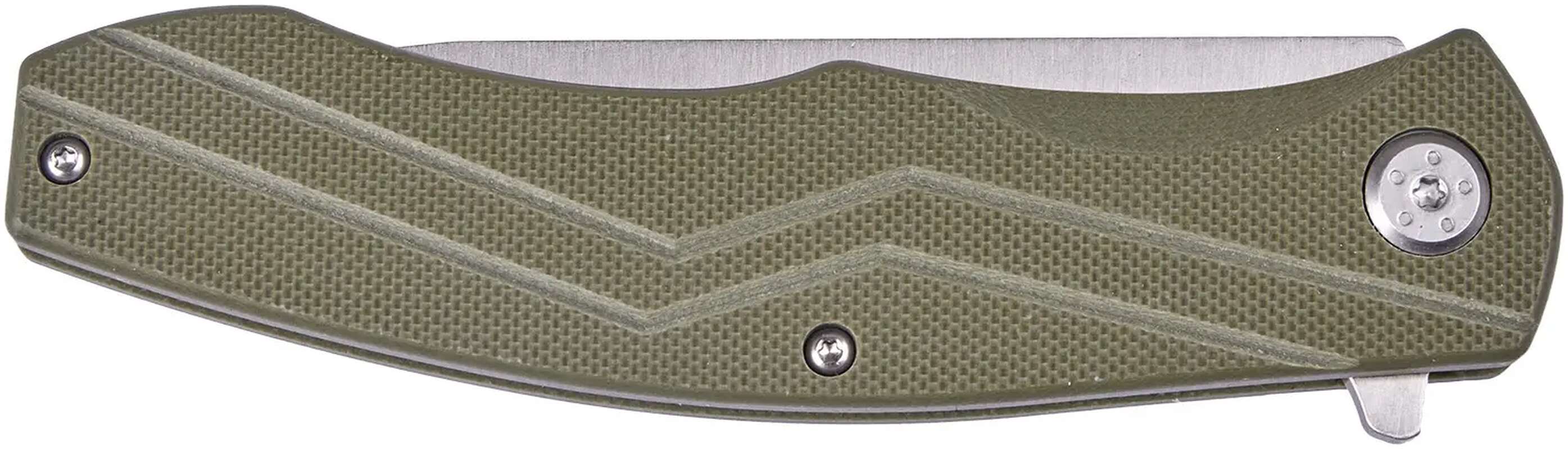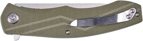 Клинок профілю Drop Point виконаний із недорогої сталі марки 3Cr13, яка відрізняється хорошими показниками корозійної стійкості, а також простотою виправлення різальної кромки. Вилучається клинок за допомогою фліпера і надійно фіксується у робочому положенні сталевою пластиною замка Liner Lock. Ніж обладнаний системою шарикопідшипників, що сприяє легкому та плавному витягуванню клинка. Увігнуті спуски починаються з 1/3 від обуха, що у поєднанні з формою клинка забезпечує ножу хороші колючі та різальні якості.