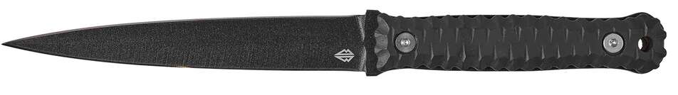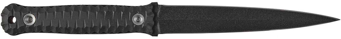 Клинок даного ножа виготовлений з нержавіючої сталі марки 1.4116, товщиною 5 мм. Дана марка сталі гартується до твердості 57 HRC та легко правиться в польових умовах без спеціального інструменту. Клинок має списоподібний профіль (Spear-Point) та симетричну геометрію на прямих спусках. З однієї сторони розташована різальна кромка плейнового типу, а з іншої – фальш-лезо. Завдяки всім цим характеристикам, клинок здобув відмінні колючі якості. Фінішна обробка клинку має чорне полімерне антиблікове покриття.