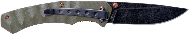 Клинок виконаний у форматі Drop point з вогнутими спусками та покриттям Stonewash темного кольору, на обуху передбачені насічки для зручного упору великим пальцем при роботі. Така форма клинка розрахована на проведення ефективного різу та уколу. Матеріалом служить сталь 440А, вона містить в собі великий відсоток хрому і гарантує високу антикорозійну стійкість. Відкривання клинка здійснюється за допомогою шпенька, а фіксація - замком Linerlock. На тильній частині клинка є насічки для зручності упору великим пальцем.