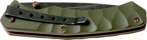 Руків'я з текстурованими накладками з G-10, має зручний вигин і односторонню кліпсу для носіння складаного ножа в положенні tip-down. Форма текстури виконана як імітація грубої кам'яної обробки, прекрасно лежить в руці.