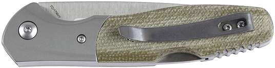 Клинок форми Drop Point виготовлений з легованої сталі 7Cr17MoV. Прямі спуски від середини і форма клинка дозволяють ножу справлятися з колючими та ріжучими діями однакового легко. Витягується клинок з допомогою нігтьового зачепу і фіксується замком Back Lock.
