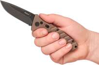 Форма руків’я дозволяє надійно утримувати ніж, чому сприяє виборка під великий палець та вказівний палець, а також насічка у верхній частині.