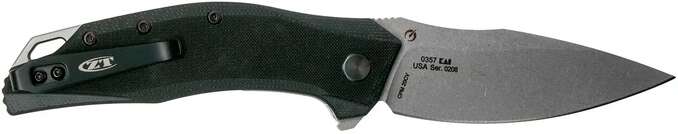 Модель ZT 0357 є об'єднанням характеристик ножа для щоденного носіння і робочого ножа. Профіль клинка типу Drop Point, обух трохи звужений - крім чисто візуальної агресивності, така форма ефективна при проколюванні, а високі спуски та плавний вигин різальної кромки полегшують різ.