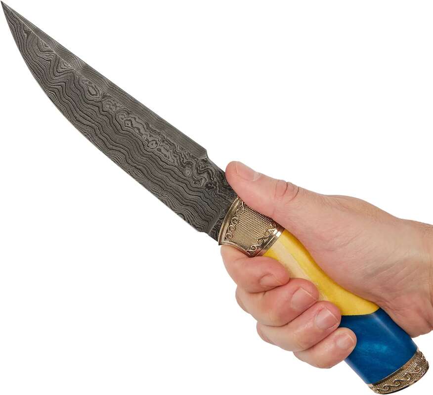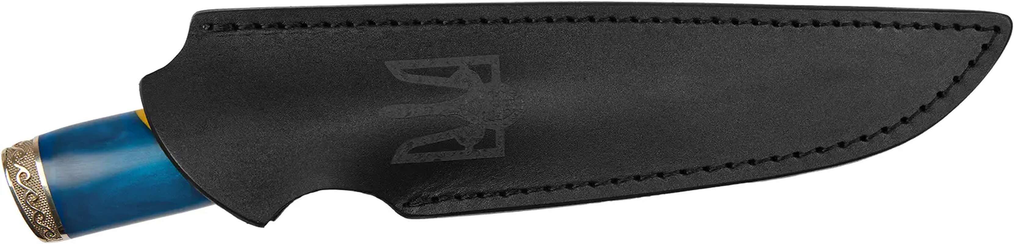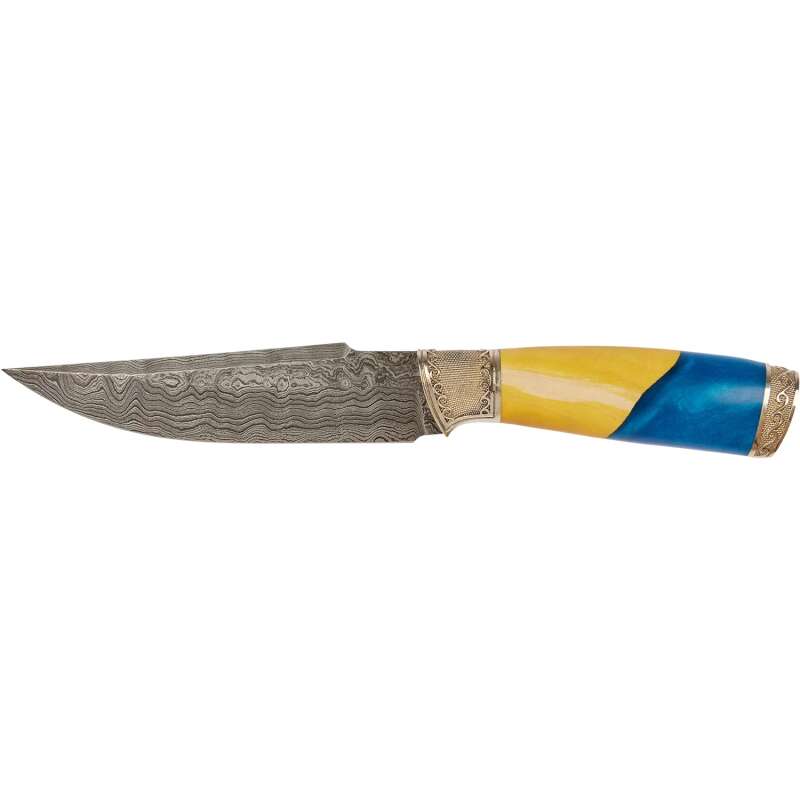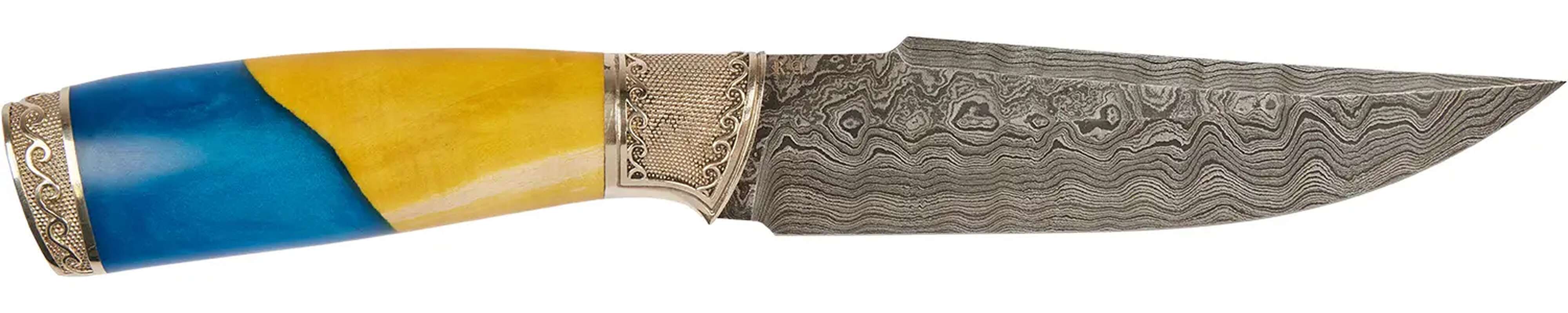 Кольори національного прапора України переливаються на рукояті цього ножа. Навершя з мельхіору прикрашено візерунком і зображенням тризуба. Також тризуб витиснутий на шкіряних піхвах. Ніж Український Дамаск від майстерні R.A. Knives не тільки красивий, але і функціональний. Широкий і досить довгий клинок виконаний зі дамаської сталі. Руків’я повнорозмірне і дуже зручна.