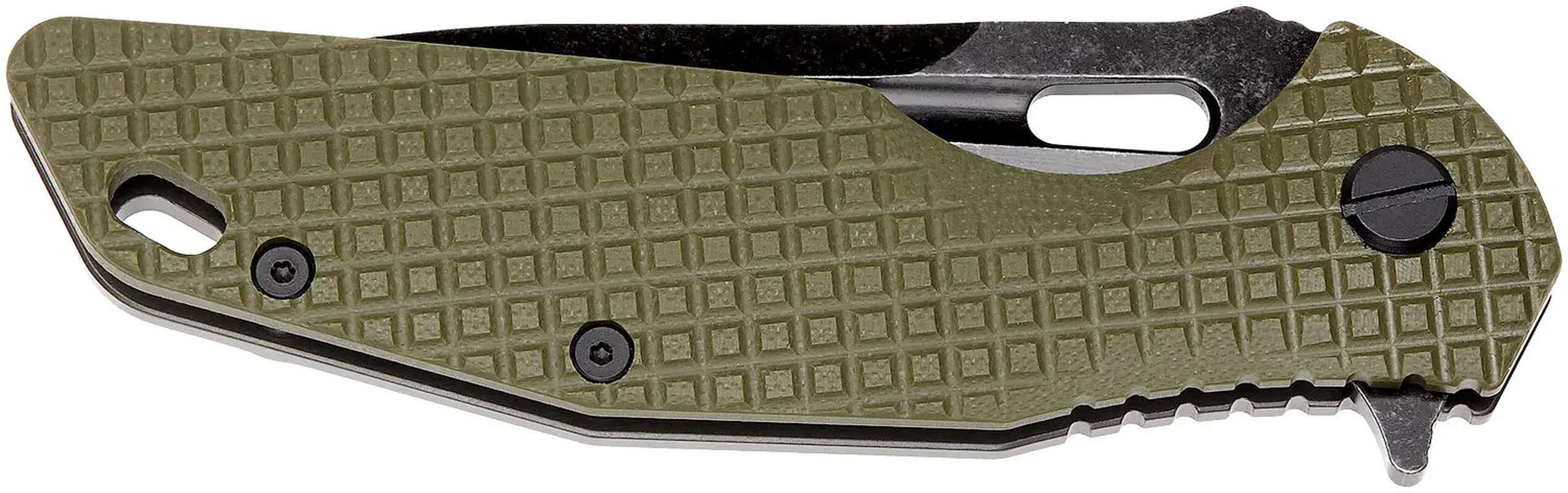 Руків'я виконане з матеріалу G10, відмінно лежить навіть у вологій руці або рукавичках. Присутня кліпса, яку при необхідності можна зняти та користуватись темляком, під який передбачено отвір.