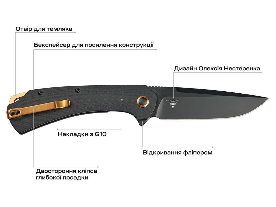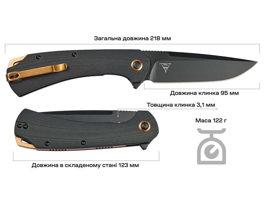 УВАГА! Для уникнення появи плям на поверхні клинка, рекомендуємо насухо протирати клинок після контакту з вологим середовищем. Тим не менш, поява плям є хімічною реакцією сталі та не є браком чи гарантійним випадком.