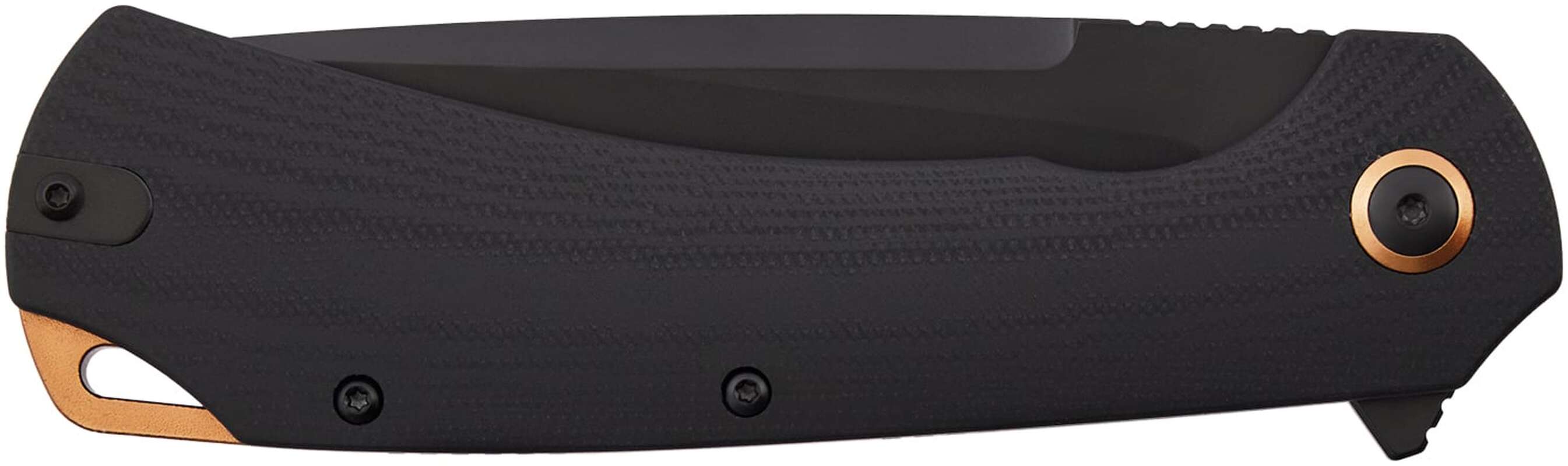 Модель Frontier має два варіанти накладок на руків’ї: приємна на дотик зелена мікарта або цупкий склотекстоліт G10. Прикрашене руків’я кільцем бронзового кольору навколо осьового гвинта. В такому ж кольорі виконаний бекспейсер, який підвищує надійність конструкції. Для комфортного носіння в кишені, передбачена двостороння кліпса глибокої посадки, а також отвір для темляка на бекспейсері.