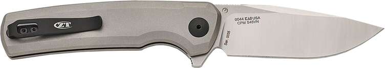 Складаний ніж Zero Tolerance 0044 – приклад сучасного джентльменського фолдера. Витончений клинок профілю Drop Point виготовлений із першокласної порошкової нержавіючої сталі S45VN американського виробництва. Сталь відрізняється неймовірною стійкістю до корозії, а різальна крайка довго залишається бритвенно-гострою. Вертикальний продольний сатиновий фініш додає шарму ножу. Приводиться в робоче положення за допомогою фліпера, а фіксація у закритому та відкритому вигляді відбувається надійним замком Button Lock. Титанове руків’я зручно лягає в руку, а ергономічна підпальцева виїмка гарантує надійний хват. Прикрашають і завершують загальний дизайн фолдера – анодована бонка та осьовий гвинт. На торці розміщена двостороння кліпса.