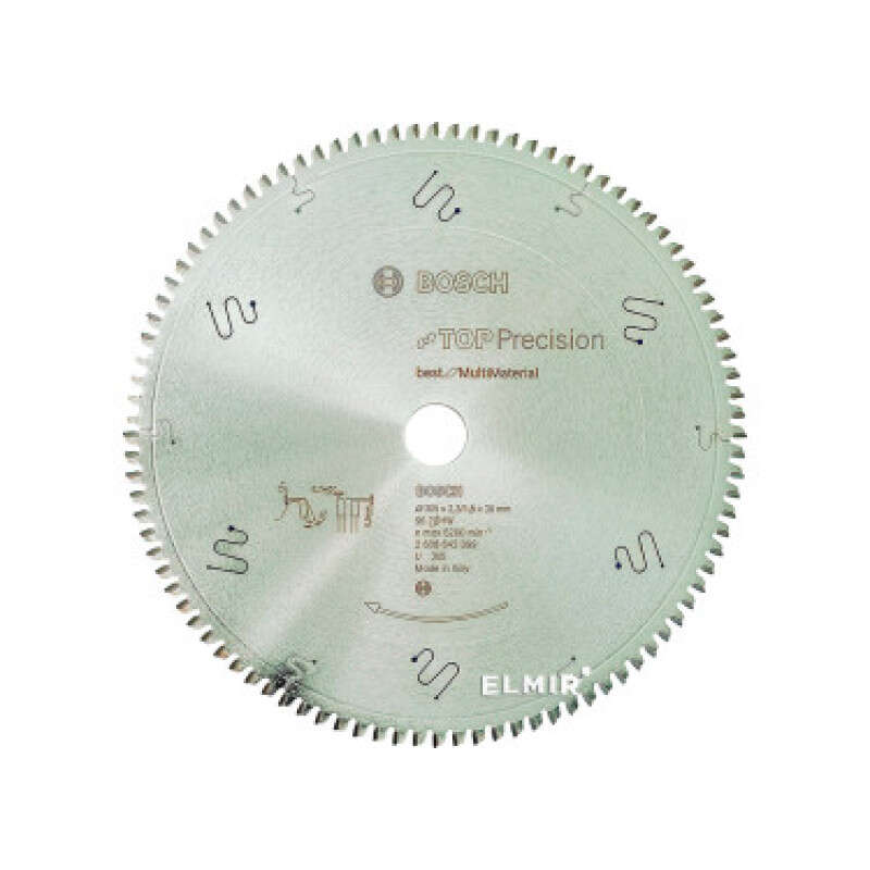- Циркулярний диск Bosch Multi Top 305 мм в діаметрі, завтовшки 1,8 мм, з посадкою 30 мм має 96 зубців HLTCG форми з переднім кутом заточки -5 градусів, заднім 15 градусів.