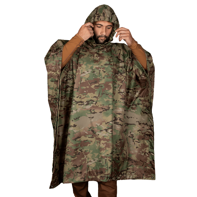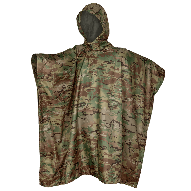 Універсальне пончо з військовим забарвленням. спеціально розроблене для воєнізованих структур. Це високоякісний виріб, виготовлений з армованої тканини Micro Rip-Stop, з поліуретановим покриттям з внутрішньої сторони, що гарантує його надзвичайну міцність і вологостійкість.