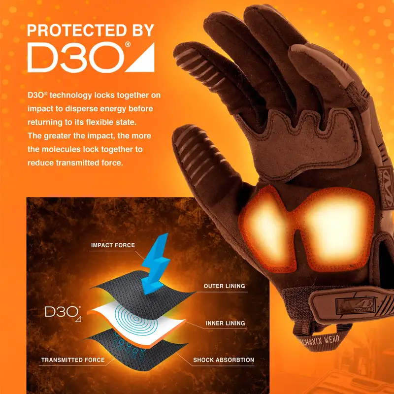 Модель M-Pact® виготовлена з високоміцної синтетичної шкіри товщиною 0.8 мм та вставок з еластичного й дихаючого матеріалу TrekDry™. Синтетична шкіра дозволяє користуватися смартфоном та іншими сенсорними пристроями, не знімаючи рукавичок. Додатково долоня посилена вставками з матеріалу D3O® та Armortex®. Вставки D3O® призначені для розсіювання енергії ударів та вібрацій, тим самим знижує втому рук. Вони виготовлені з термопластичної гуми (TPR) яка сертифікована за стандартом EN 13594.