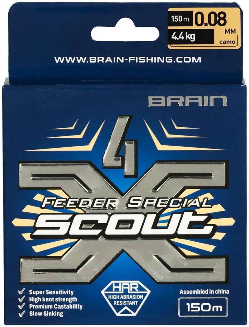 Шнур Brain Scout 4X підходить під різні види риболовлі, особливо під фідерну. Він має високу абразивостійкість та тонучі характеристики, тому добре прорізає воду, підвищуючи чутливість снасті, а також менше схильний до зносу при постійних контактах з дном. Шнур має щільне плетіння з 4-x ниток з подальшою поверхневою обробкою, завдяки чому є достатньо гладким і сковзким, що позитивно позначається на дальності закидання.