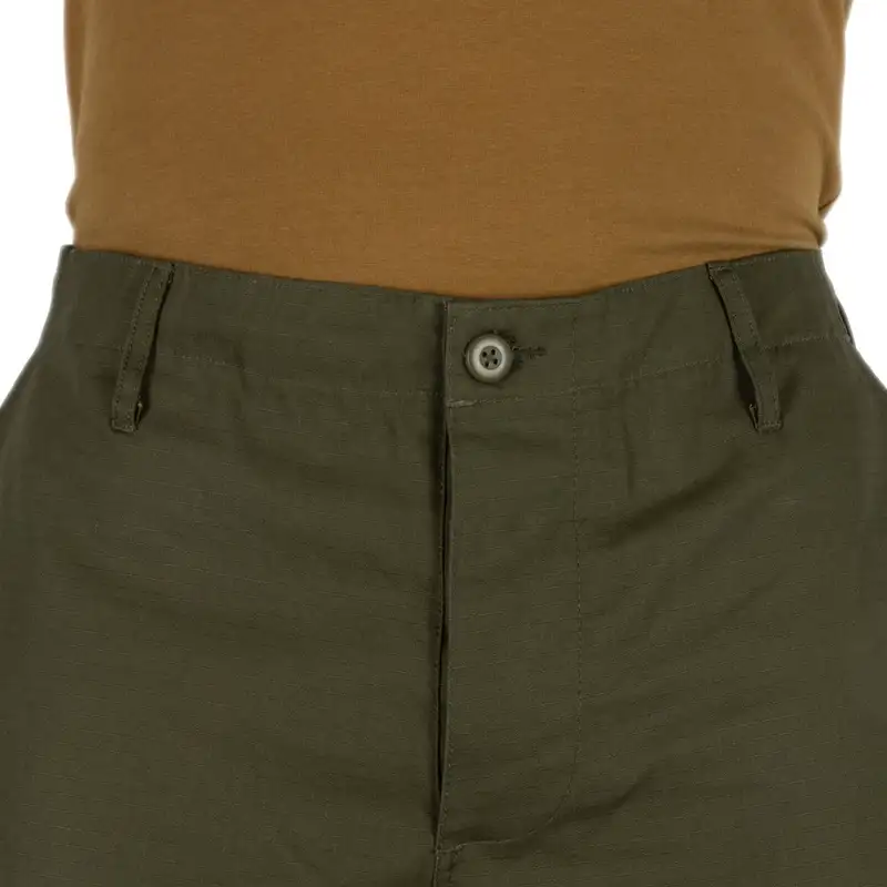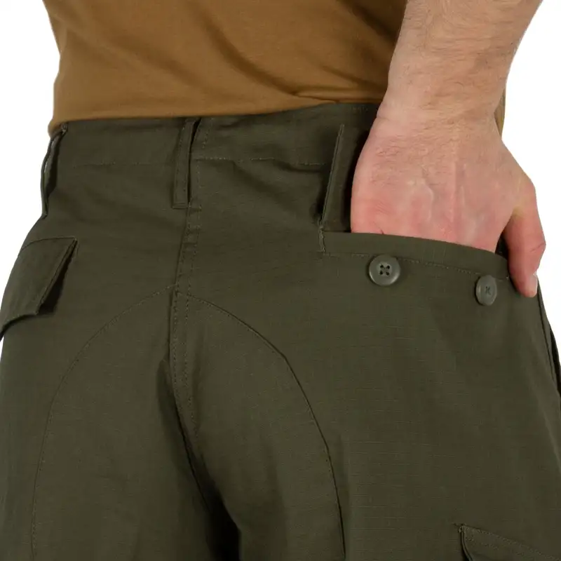 Сідничну частину штанів яка є стресовою зоною, задля більшої зносостійкості, підсилено дублюванням тканини. Розташування кишень дозволить зручно розмістити необхідне спорядження. Зверху штани мають дві основні глибокі кишені, нижче - дві карго-кишені з клапанами на липучці для розміщення габаритного спорядження. Їх особливістю є резинка для утяжки верхньої частини кишені, що запобігає випаданню предметів. Ззаду є дві врізні кишені з клапанами на ґудзиках і дві невеликі кишені внизу штанини. Сім широких петель на поясі дозволяють використовувати широкі ремені, на яких можна кріпити додаткове спорядження. Окрім петель всередині поясної частини є шнурок-затяжка, який регулює посадку штанів відповідно до талії власника.