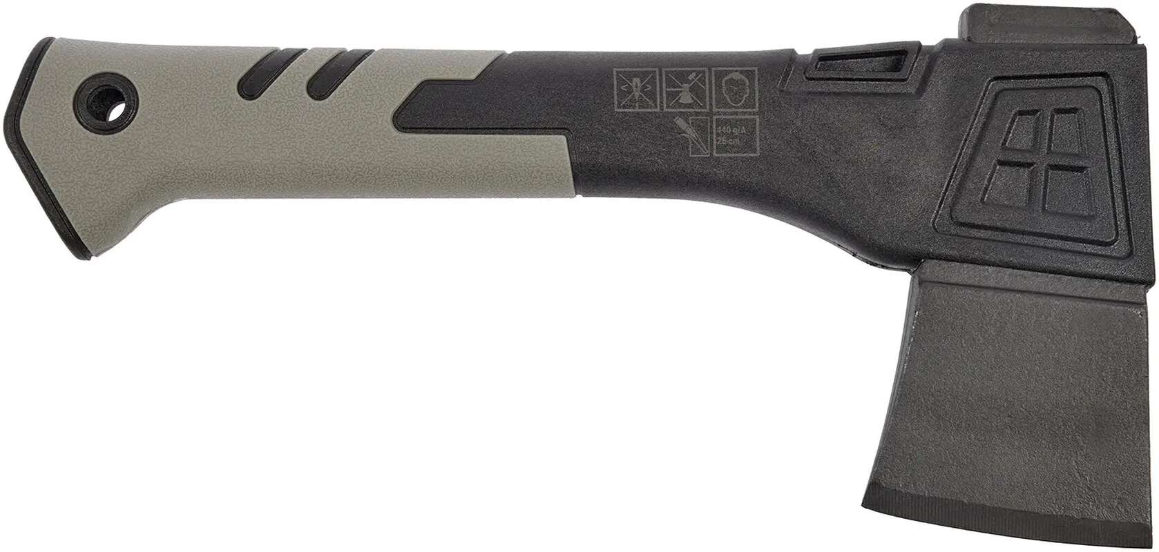 Топорище виконано з полімеру доповненого прогумованими вставками для зручності при утриманні. В нижній частині присутній отвір для ремінця.
